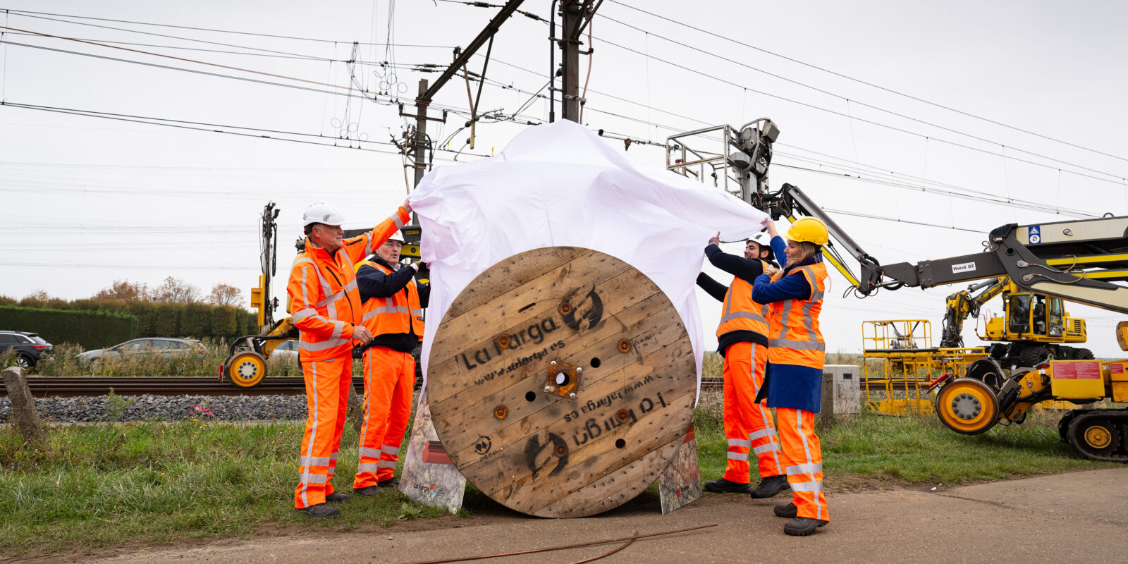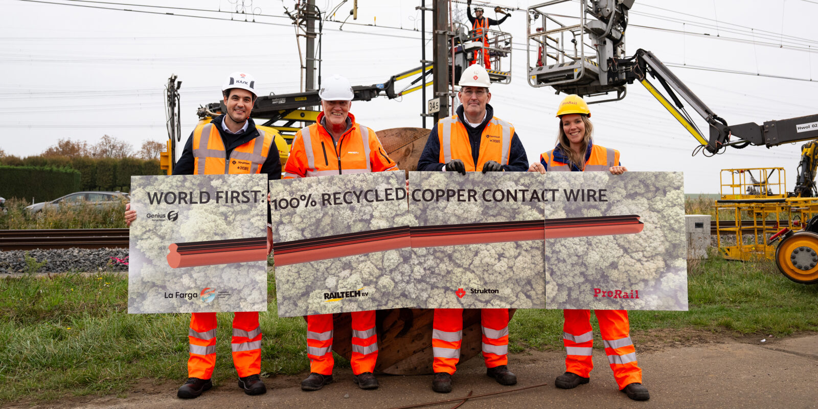 Strukton Rail has installed contact wire made of 100% recycled copper at the Zeeuwse lijn, a railway line in the South of the Netherlands. This means a sustainable world first for the Dutch railway sector, made possible owing to a collaboration between the Spanish manufacturer La Farga, supplier Railtech BV, contractor Strukton and railway manager ProRail. On Saturyday 11 October, La Farga, Railtech BV, ProRail and Strukton gathered in Zeeland to celebrate this sustainable innovation.